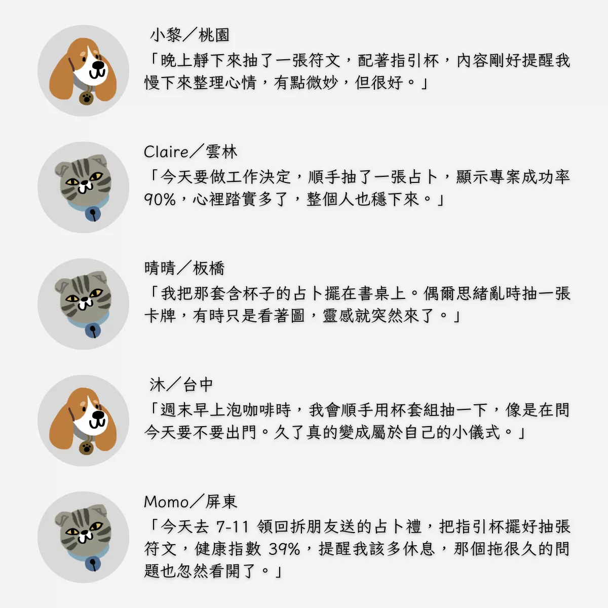 A:建議問近期的實際問題最合適!像是感情、工作、合作、搬家、創業⋯⋯舉例:「這份工作投遞的適合度?」「跟他告白有幾分勝算?」醫療/法律等專業領域的問題還是建議找專業人士喔~