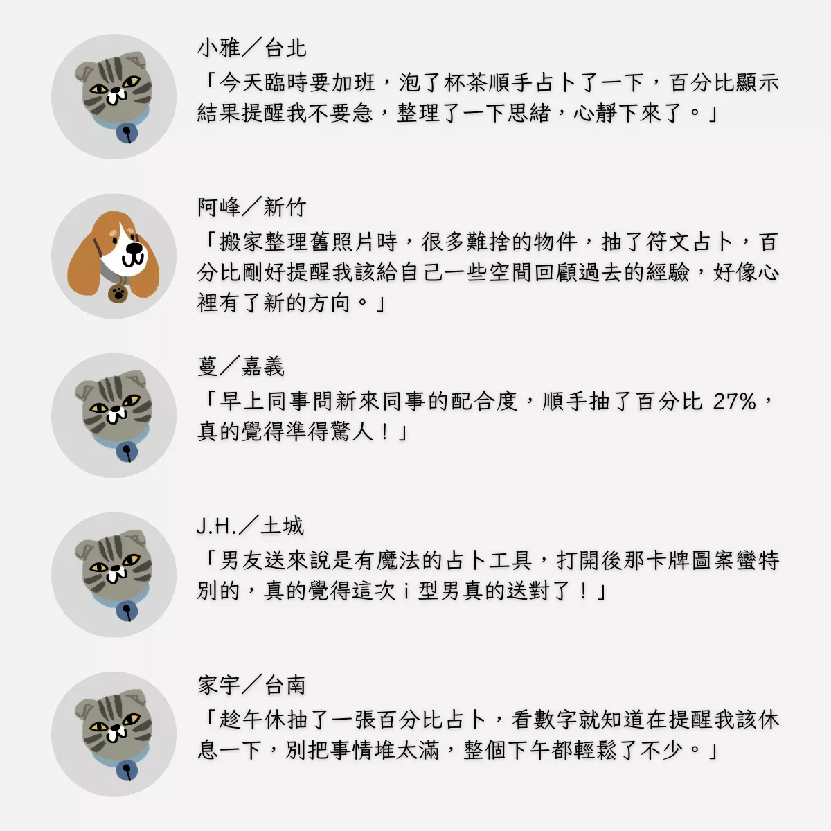 A:我們相信,人生沒有絕對,只有機率。這套占卜會給你一個「兩數相加的百分比」,幫你看出事情成功、改變、突破的可能性。一點點像量子變化,一點點像命運密碼。